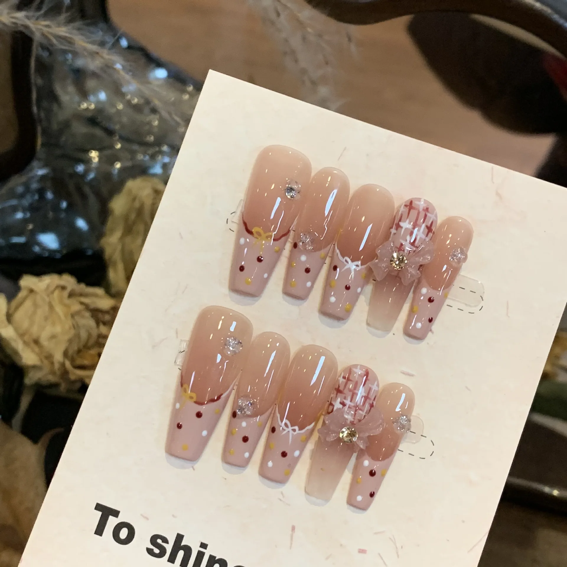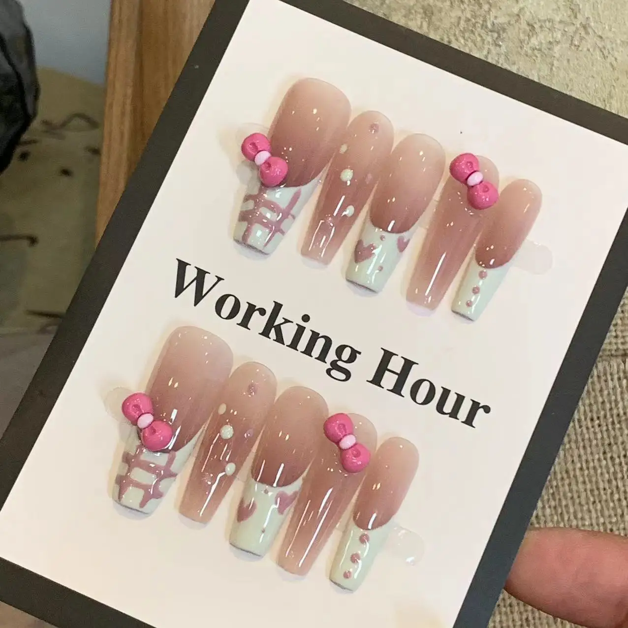 10pc ✨ Parisian Charm – Luxury French Press-On Nails | Handmade Long Ballet with Cute Bear & Diamond Accents, Reusable Full Cover Set ✨