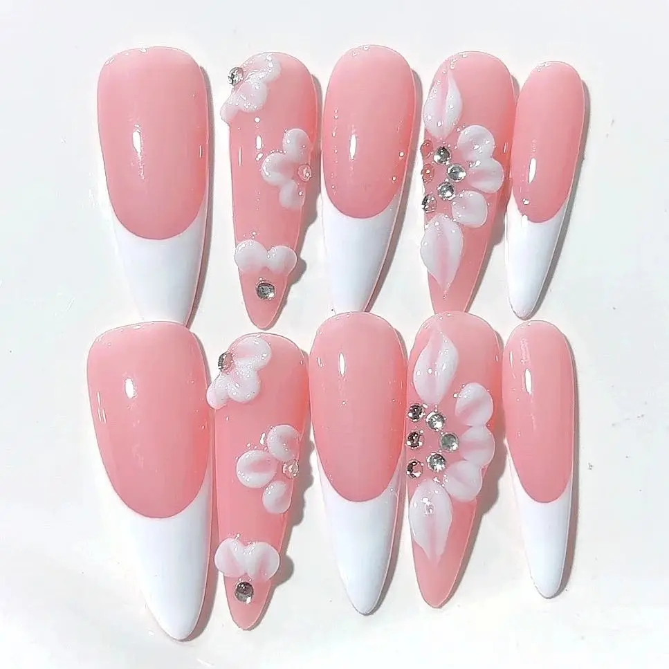 luxury French press-on nails, handmade pink nails, white tip press-on nails, 3D floral French nails, reusable acrylic nails, Blush Fleur nails, bridal nails, elegant French manicure
