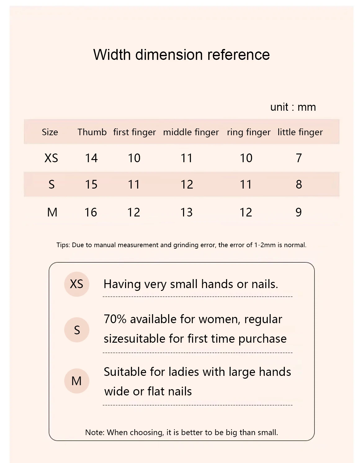 3. warm reminder: before purchasing, please measure your nail width and choose the appropriate size;