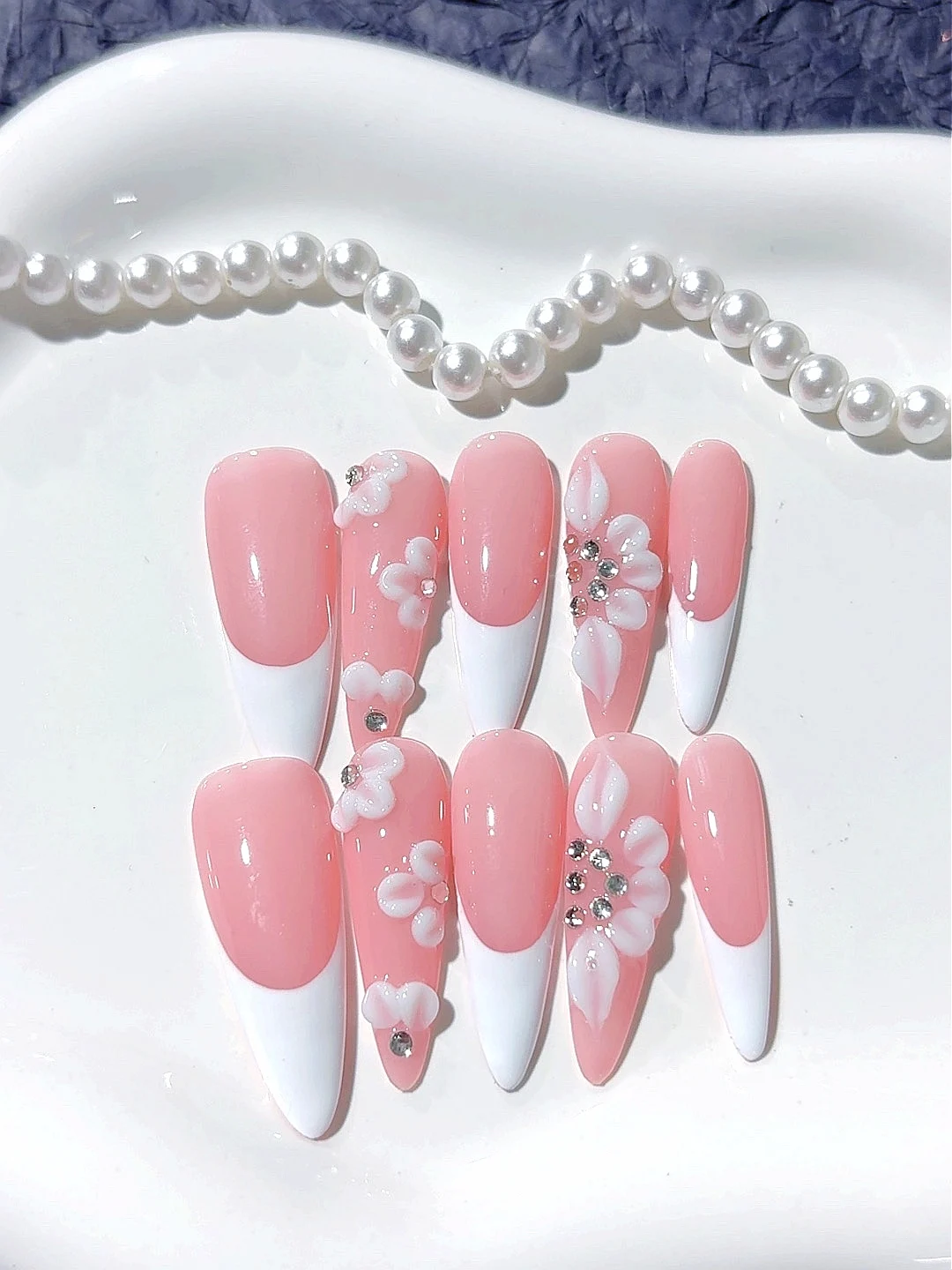 10pcs ✨ Blush Fleur – Luxury French Press-On Nails | Handmade Pink with White Tips & 3D Floral Accents, Elegant Reusable Set ✨