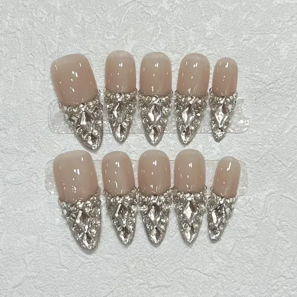 luxury press-on nails, rhinestone nails, almond shape nails, nude pink press-on nails, reusable nails, handmade nail art, Crystal Veil nails