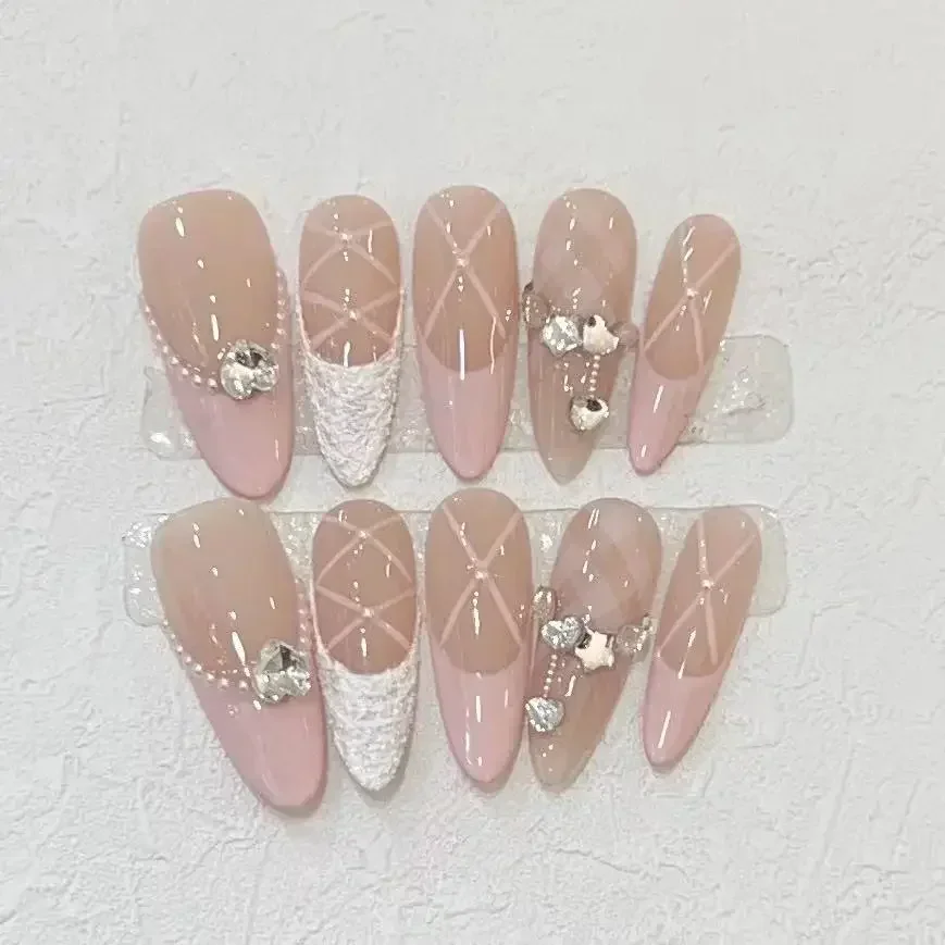 - 💎 Elegant nude pink base with delicate rhinestone accents