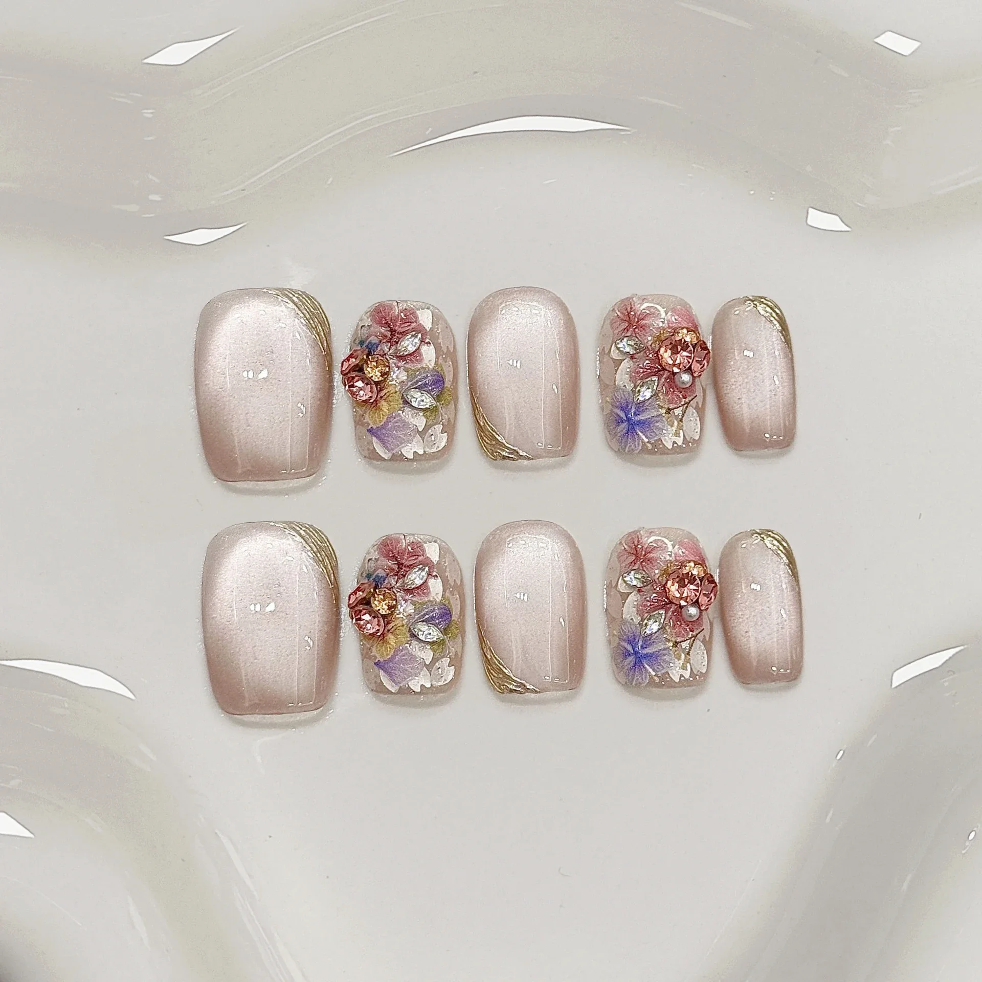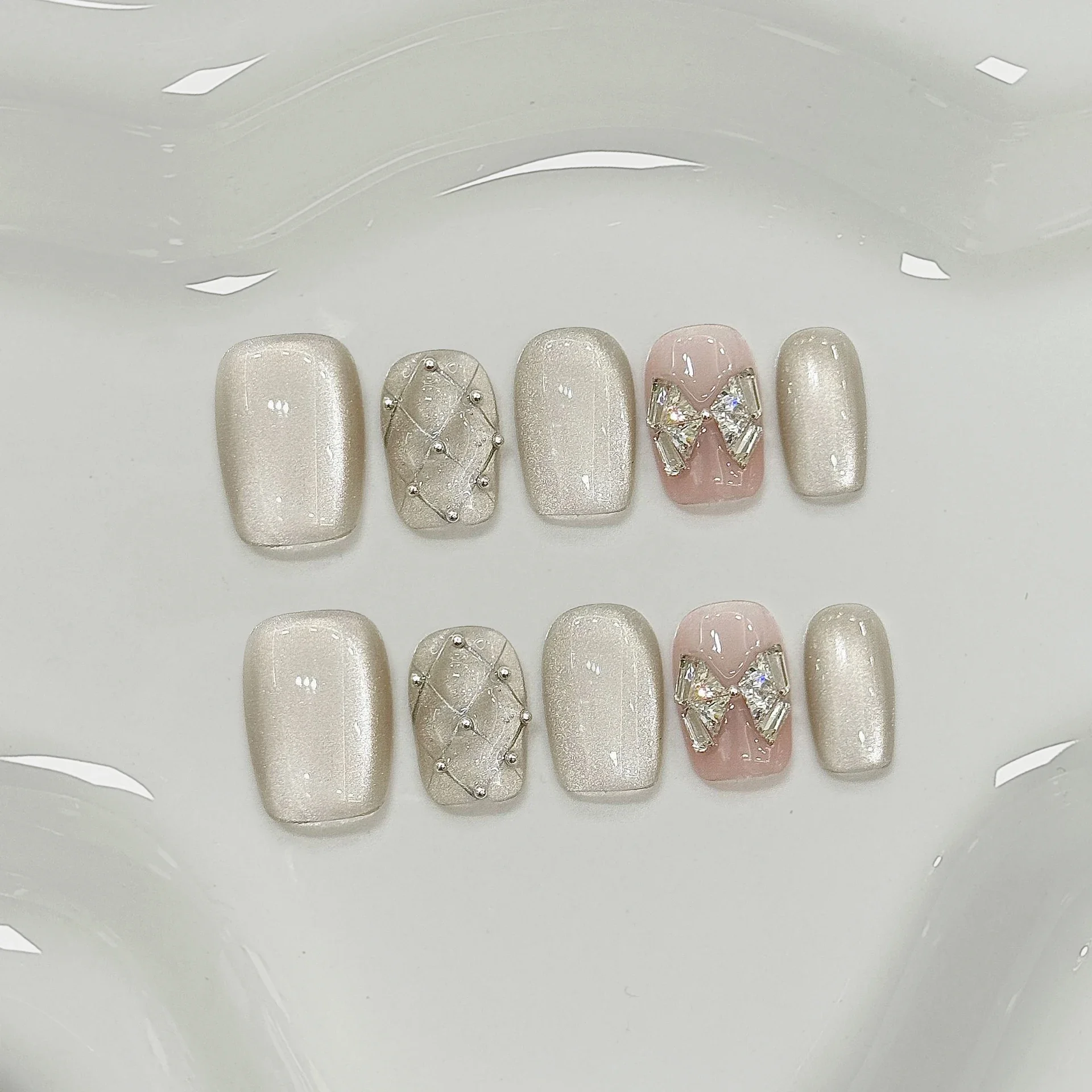 10Pcs ✨ Pearl Ballet – Luxury Short Press-On Nails | Handmade Nude Cat-Eye with Quilted & Rhinestone Accents, Reusable Elegant Set ✨
