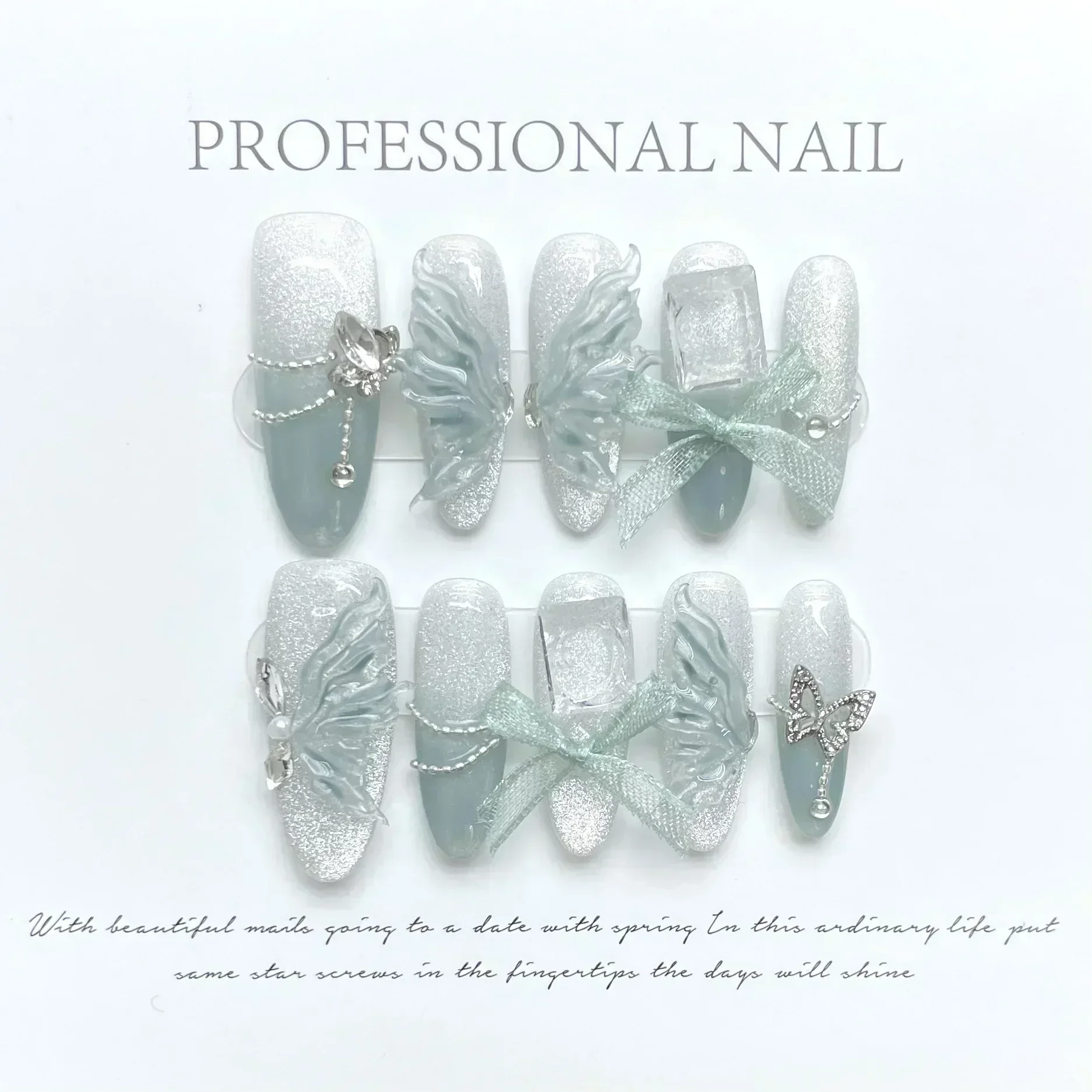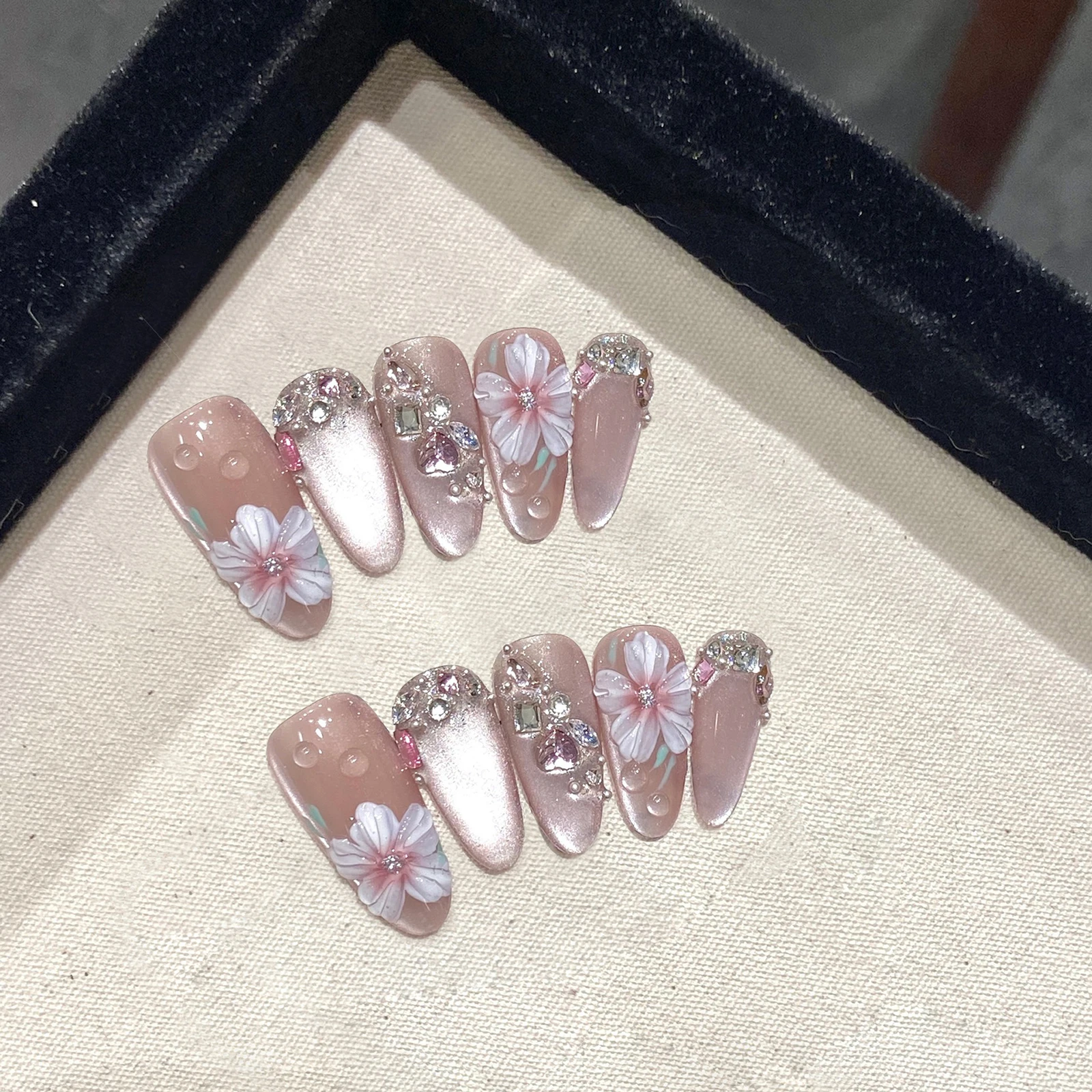 - 10 handmade press-on nails with rhinestone camellia design