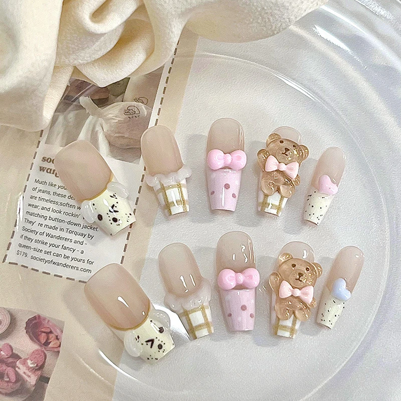 10pcs ✨ Teddy Charm – Luxury Press-On Nails | Handmade Nude French with 3D Bear, Plaid & Bow Accents, Cute Reusable Set ✨