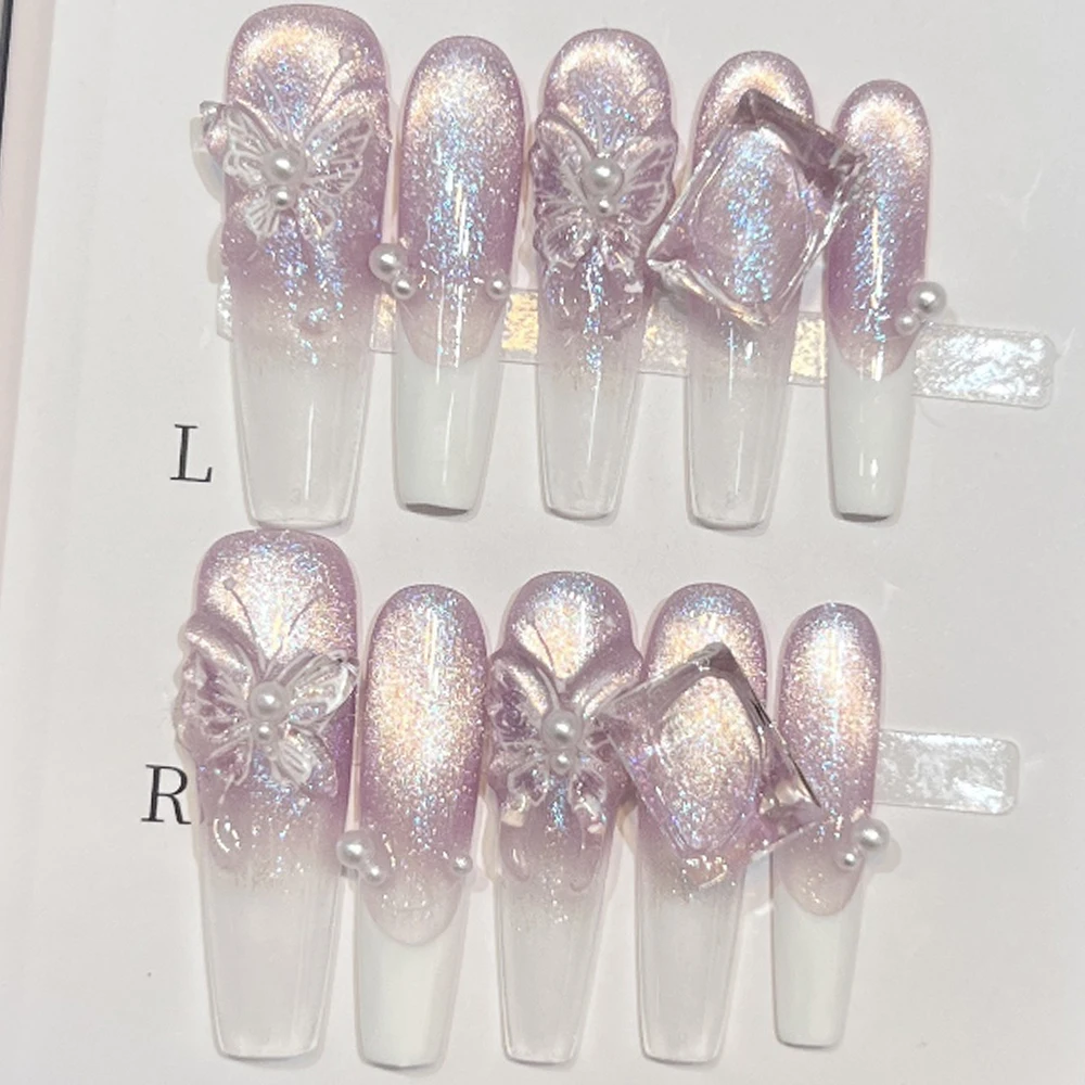 10pcs 💎 Glam Stiletto Elegance – 10pcs Handmade Long Coffin Press-On Nails | Cat-Eye Effect, Pearls, Diamonds & Bowknot Details ✨👑