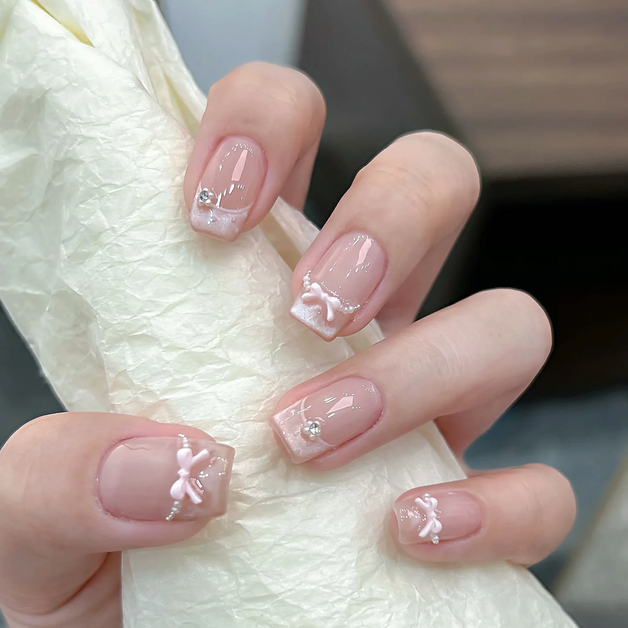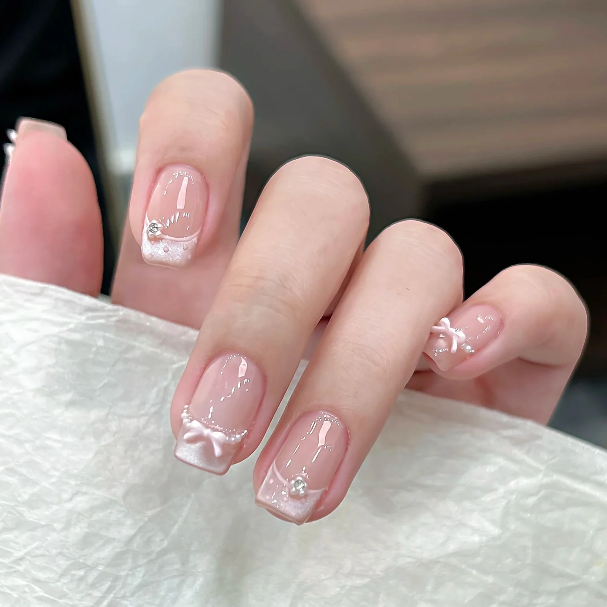 luxury pink press-on nails, cat-eye french nails, princess style nails, bow accent nails, handmade reusable nails, elegant nail art, polka dot manicure, wedding false nails